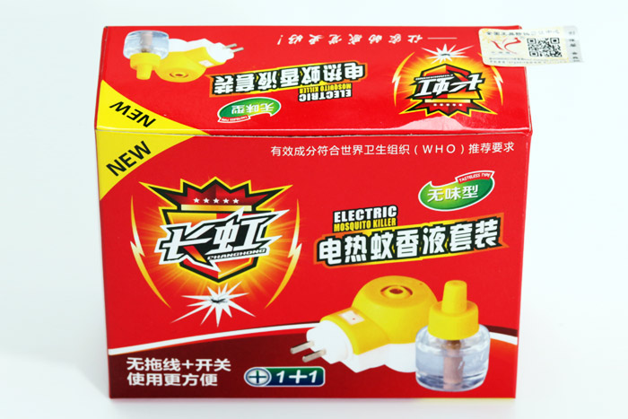 电热液体蚊香具有:无烟、无异味、无灰、无污染;使用PTC加热源安全;使用时间随心所欲,用时送电、不用时断电,使用十分方便。一瓶药剂约可连续使用300h(受PCT温度影响);无须机械设备亦可生产等优点